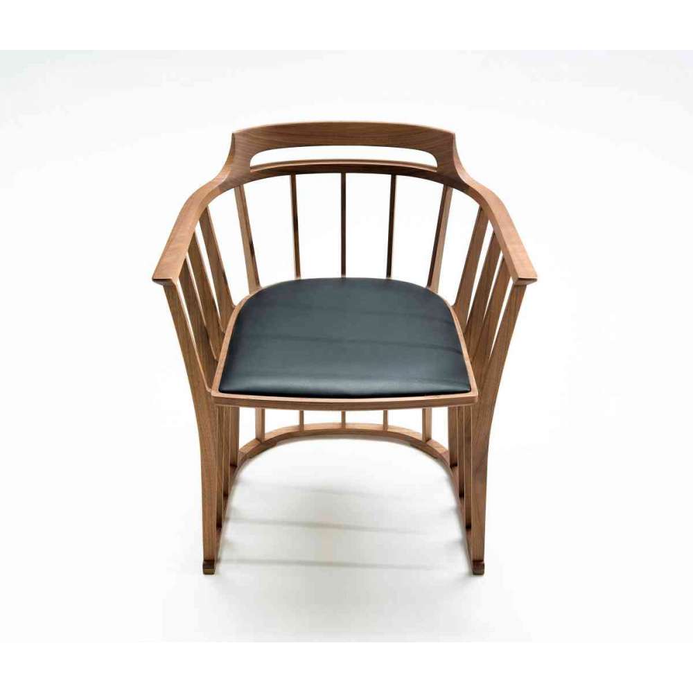 Mały fotel wykonany z litego orzecha amerykańskiego. Siedzisko z tapicerowanej sklejki. Trzynaście listew z litego orzecha amerykańskiego utrzymuje ramę razem.