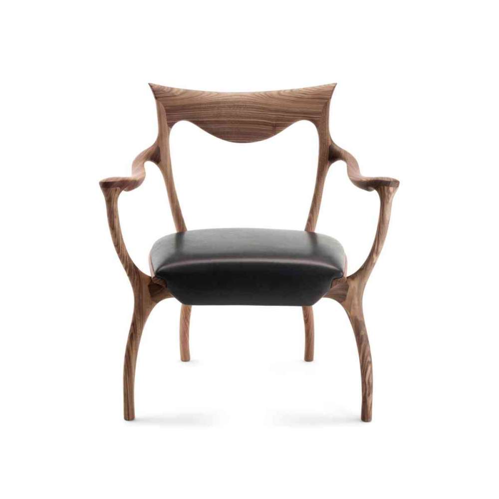 Fotel o konstrukcji z litego orzecha amerykańskiego, siedzisko z tapicerowanej sklejki.
