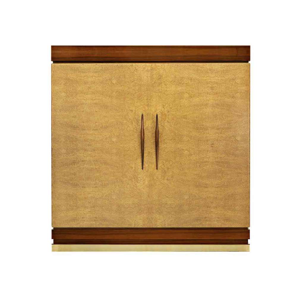 Szafa wykonana z palisandru, wnętrze z drewna klonowego, uchwyty z hebanu i palisandru. Wewnętrzna szuflada, metalowe części z polerowanego mosiądzu i pergaminowe drzwi.