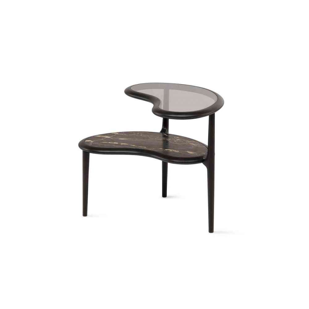 Mały stolik wykonany z litego orzecha amerykańskiego, podwójny blat ze szkła 4 mm lub górny blat ze szkła i dolny blat z marmuru. Wykończenie szkła może być transparentne, brązowane lub dymione.