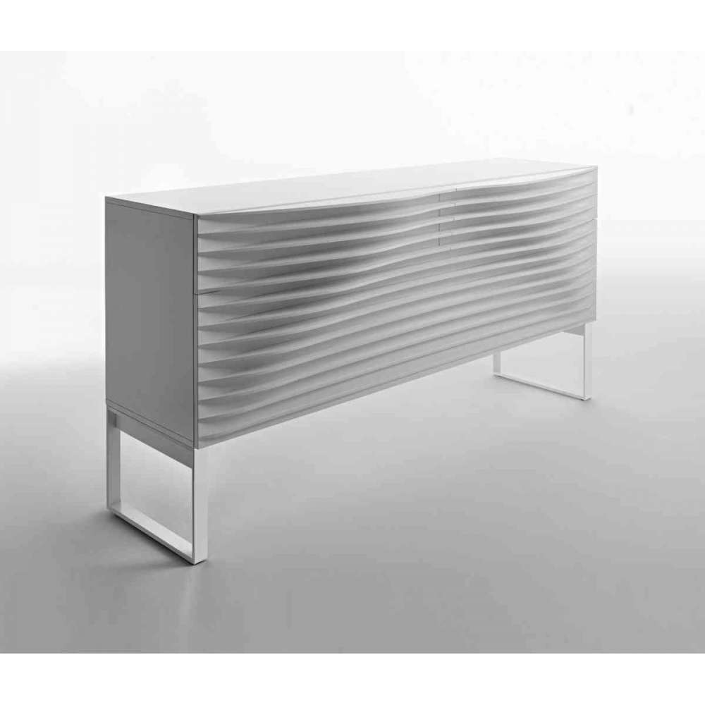 Tide odzwierciedla styl swojego projektanta, Karima Rashida, który w tym projekcie pracował z różnymi ruchami i dynamiką. Pozioma zabudowa frontu, wykonana z równomiernie rozmieszczonych cienkich płyt MDF, nadaje całości łagodności i rzeźbienia. Oprócz nietuzinkowego designu, Tide występuje jako pojemna i funkcjonalna szafka, z dwiema szufladami i frontem z klapą do salonu lub z dwiema szufladami i dwiema głębokimi szufladami do sypialni. fronty z płyty wiórowej melaminowanej i lakierowanej. Grubość konstrukcji i przegrody poziomej stałej: 18 mm, przegrody pionowej stałej: 36 mm, ścianki tylnej: 10 mm. Efekt marszczenia na drzwiach i frontach szuflad z lakierowanej płyty MDF o grubości 10 mm. Drzwi klapowe: zawiasy z podstawą w kształcie podwójnego krzyża i regulacją wysokości za pomocą mimośrodowych ciągłych śrub wiatrowych oraz tłok gazowy z kontrolowanym otwieraniem. Szuflady i kosze z całkowicie wyjmowanymi samoblokującymi prowadnicami i bokami wykonanymi z anodyzowanego aluminium. Zderzaki z PCV lub filcu. Malowane regulowane nóżki ABS z aluminiowym wykończeniem. Podstawa o wysokości 16 cm lub 32 cm, wykonana z blachy stalowej malowanej proszkowo.