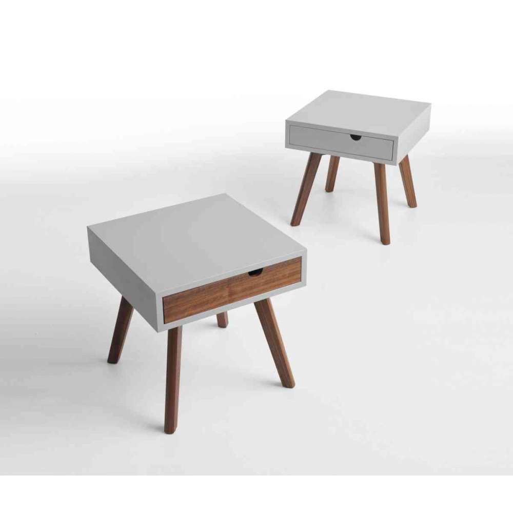 Solidne nogi czarny orzech, struktura MDF lakierowany na mat. Szuflada wysuwana z obu stron z płyty MDF fornirowanej orzechem z jednym frontem z orzecha włoskiego i drugim lakierowanym w tym samym kolorze co blat. Wewnątrz konstrukcja zawsze lakierowana na biało.
