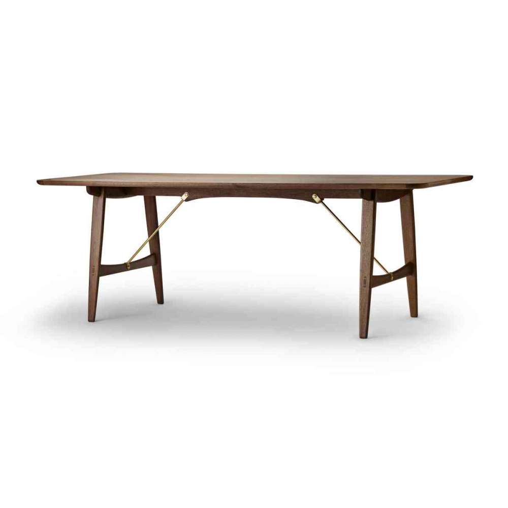 Stół myśliwski Børge Mogensena, zaprojektowany w 1950 roku, emanuje zachęcającą, organiczną elegancją. Stół składa się z dwóch kozłów z ustawionymi pod kątem nogami i wąskiego fornirowanego blatu z zaokrąglonymi narożnikami i krawędziami z litego drewna. Charakterystyczne połączenia wpustowe i czopowe na nogach, uzupełnione klinami z kontrastowego drewna, aby podkreślić wysoką jakość wykonania, stanowią kolejny elegancki element. Stabilność są maksymalizowane dzięki dwóm ukośnym usztywnieniom zamontowanym między ramą a blatem – funkcjonalny akcent, który podkreśla ręczny charakter stołu. Stół dostępny jest w różnych rodzajach drewna i wykończeniach.