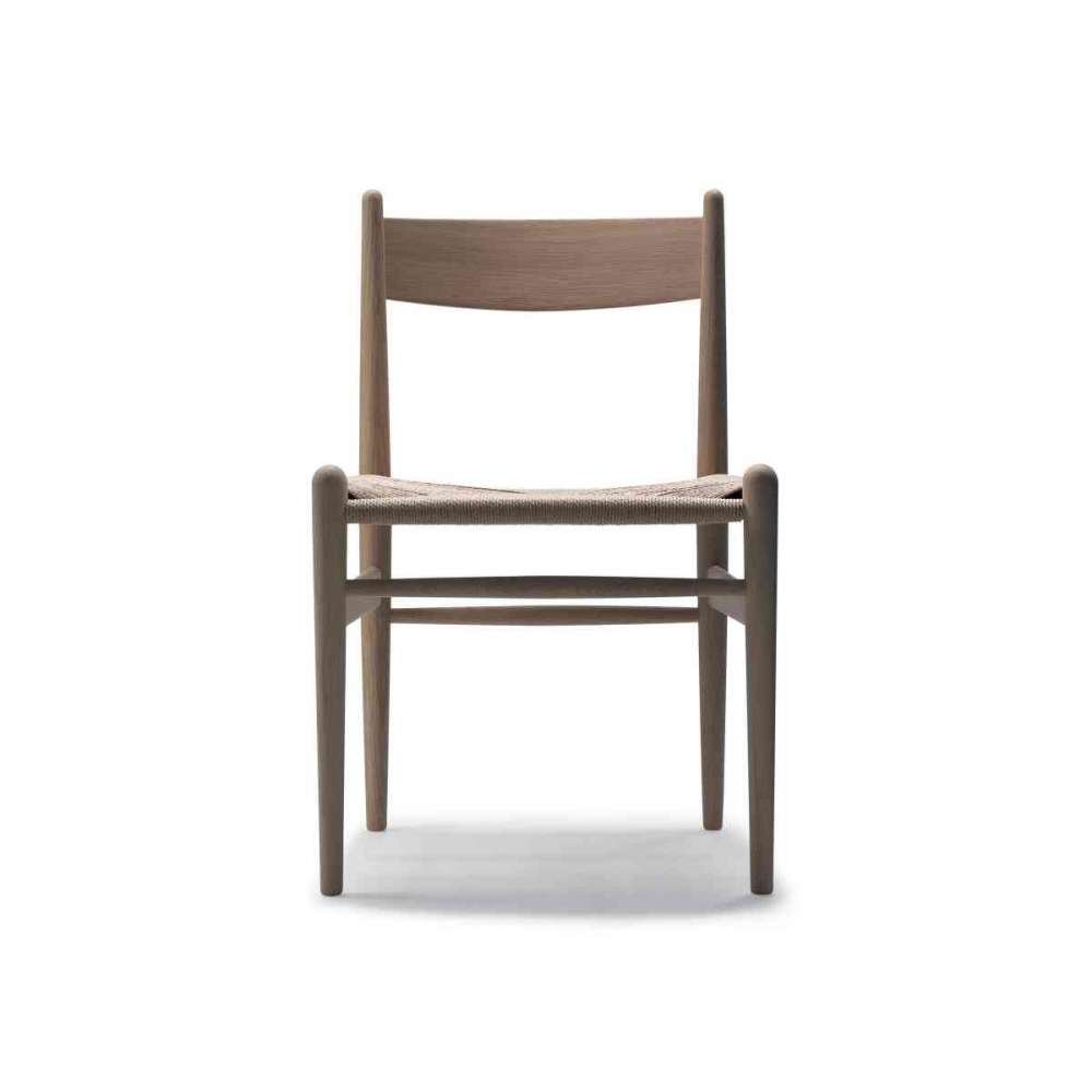 Czyste krzesło do jadalni, na którym wspaniale się siedzi, a jego projekt wyraźnie pokazuje, jak Hans J. Wegner był mocno inspirowany rzemiosłem Shakera. Krzesło jest ściśle związane z krzesłem do jadalni CH37 firmy Wegner z podłokietnikami i jest również popularnym wyborem do użytku konferencyjnego i kościelnego. Siedzisko jest pięknie ręcznie tkane z wytrzymałego sznurka papierowego, w kolorze naturalnym lub czarnym. Dostępne z duńskiego drewna liściastego (dąb, buk) w różnych wykończeniach (mydło, olej, lakier, bejca).