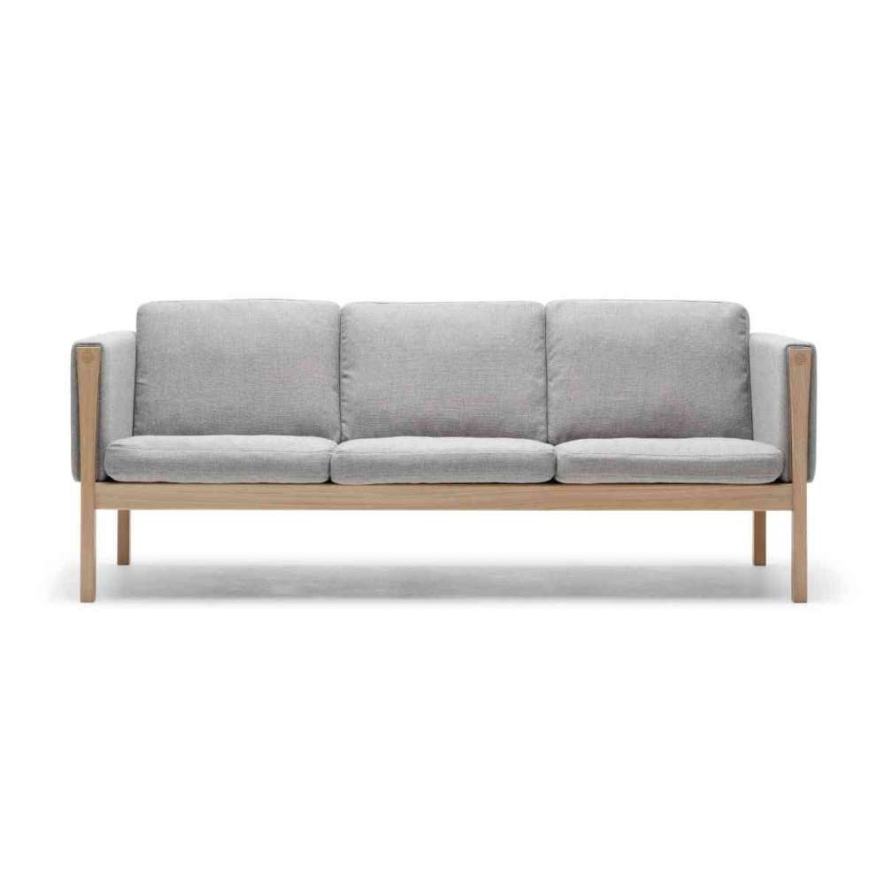 WYRAŹNY DESIGN O MIĘKKIM WYGLĄDZIE Wyściełane poduszki wypełnione puchem były innowacją, gdy Hans J. Wegner zaprojektował swój nowoczesny salon w 1965 roku. Miękkie poduszki sprawiają, że surowy projekt jest mniej formalny. Konstrukcja nóg jest doskonałym przykładem tego, jak Wegner nie przesadzał z detalami: sama noga ma cztery proste boki, ale w kierunku podłokietników przód rozszerza się, tworząc trójkąt. W środku tego trójkąta znajduje się powiększony drewniany kołek, który jest nie tylko elegancki, ale również skrywa wkręt, co znacznie ułatwia pracę tapicerowi. Genialny, piękny i praktyczny – a więc typowy dla Wegnera. Asortyment wykonany jest z dębu, orzecha i jesionu w różnych wykończeniach, a tapicerka występuje w niezliczonych kolorach i fakturach.