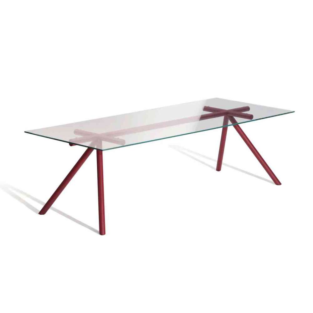 W to stół z blatem ze szkła hartowanego, który podkreśla strukturę podstawy, chromowanej, nieprzezroczystej lub lakierowanej stali rury o średnicy 50 mm. Metalowa konstrukcja, centralna cecha stołu, składa się z trzech części: centralnej rury i dwóch nóżek, które można szybko i łatwo wsunąć w celu uzyskania doskonałego wykończenia. Stół jest dziełem projektanta Gabriela Teixidó, który w fazie twórczej zastosował niemal podświadome skojarzenia pomysłów: metalowa konstrukcja = rura = stabilność = logiczna ekspresja = łatwy montaż = rozwiązanie = wyobraźnia = wykonanie. Rezultatem jest stół, w którym szklany blat staje się niemal niewidocznym obramowaniem cokołu, co wyraża jego współczesny charakter zarówno w kształtach, jak i kombinacji dostępnych materiałów.