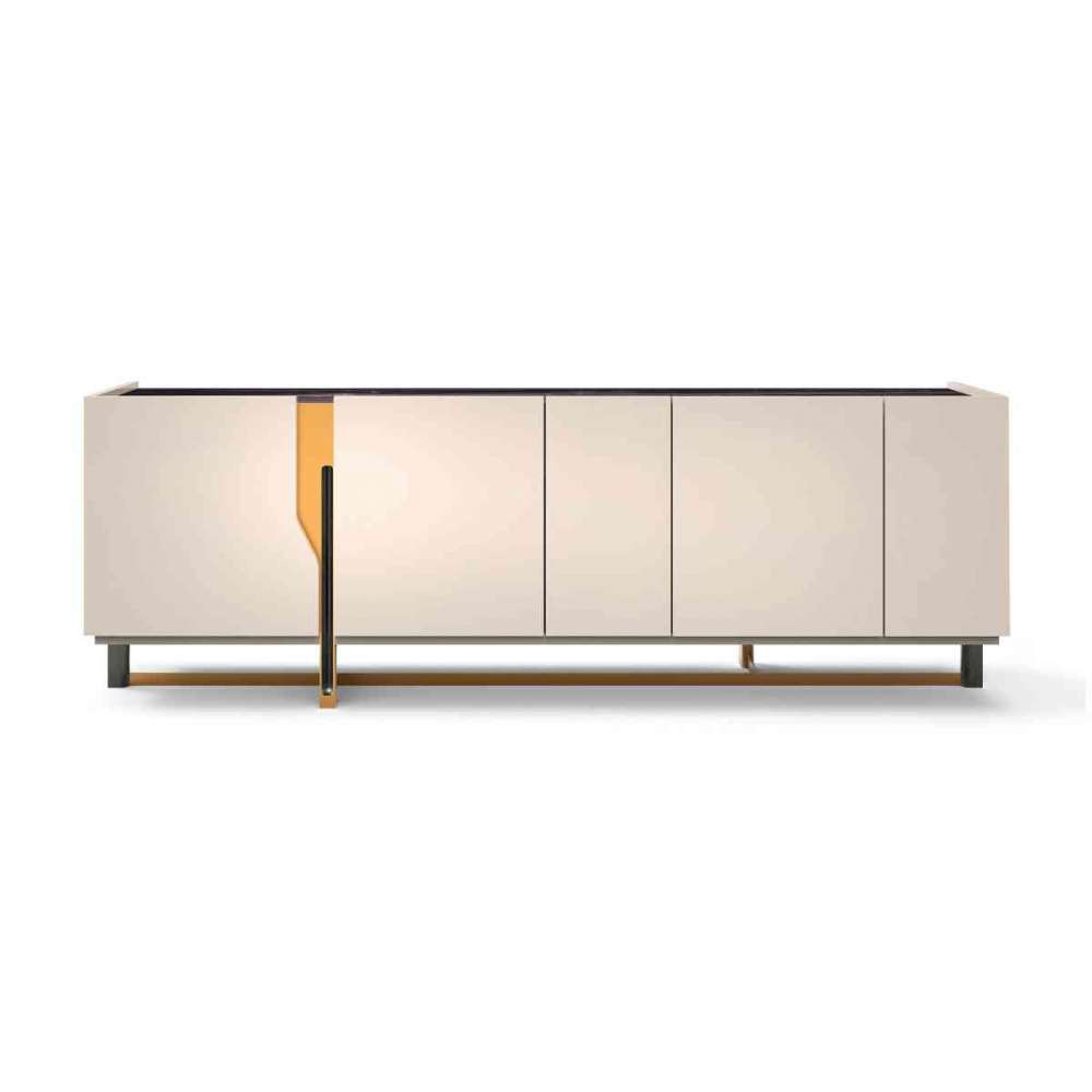 Drewniany kredens Mirage z 4 drzwiami. Konstrukcja jest drewniana, a podstawa wykonana jest z pojedynczego metalowego bloku, który został wydrążony i wbity od wewnątrz. Górna część może być ozdobiona marmurową lub pokrytą powierzchnią. Unikalne otwieranie bocznych drzwi skrywa kontrastujące wnętrze w kolorze ziemistej marokańskiej pomarańczy. Kombinacje pełnych i pustych przestrzeni, wykończeń i kontrastów dają naprzemienne efekty światła i cienia, które przywodzą na myśl ustawienia wokół geometrycznie czystych kształtów. Idealna komoda do nowoczesnego salonu.