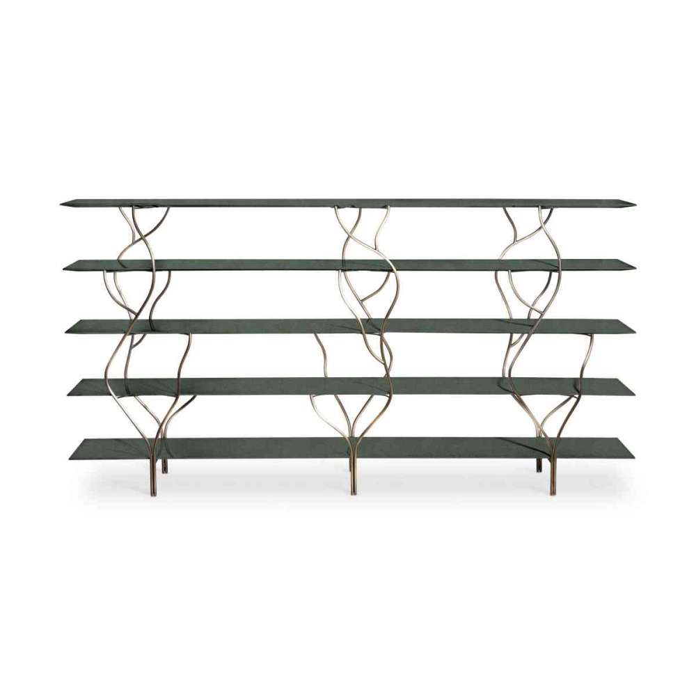Regał Albero design z żelaza z drewnianymi półkami. Konstrukcja nośna wykonana jest z zakrzywionego żelaza z dekoracjami z brązu iz pantografowanymi półkami w kształcie „tacy”. Wszystkie wykończenia są wykonane ręcznie. Jest dostępny w dwóch długościach, aby wzbogacić ścianę klasycznej aranżacji, a także doskonale nadaje się do samodzielnego postawienia, aby podzielić otwartą przestrzeń.