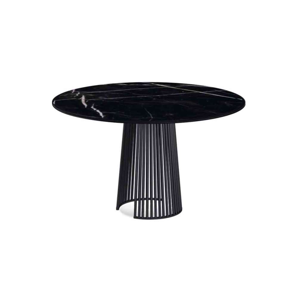 Centralna stopa zastępuje środek nosidełka, który tworzą ustawione obok siebie metalowe profile. Eliptyczny kształt utworzony przez powtarzające się metalowe rurki ułożone obok siebie odsłania oryginalny projekt stołu Seri. Kolejne metalowe rurki, które mają formę powtarzającego się eliptycznego owalnego kształtu blatu.