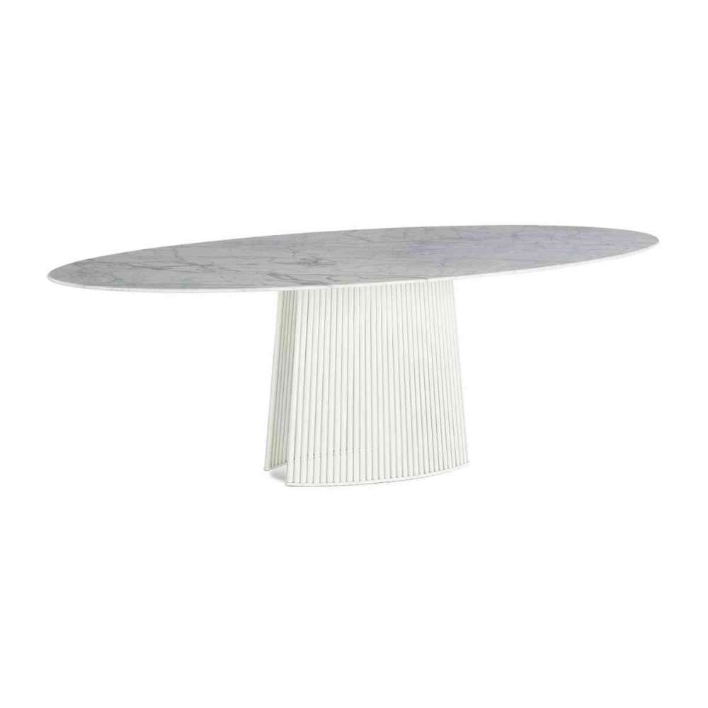 Centralna stopa zastępuje środek nosidełka, który tworzą ustawione obok siebie metalowe profile. Eliptyczny kształt utworzony przez powtarzające się metalowe rurki ułożone obok siebie odsłania oryginalny projekt stołu Seri. Kolejne metalowe rurki, które mają formę powtarzającego się eliptycznego owalnego kształtu blatu.