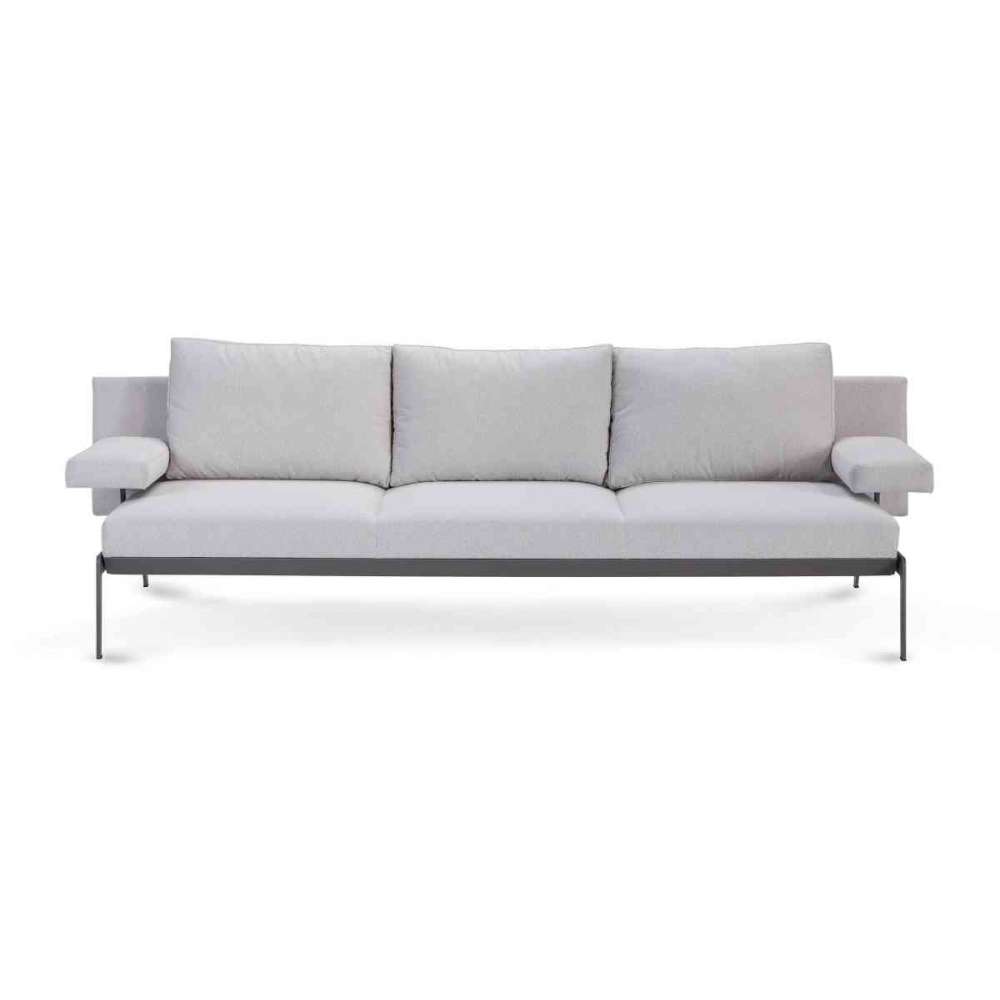 Siedzisko z pianki o grubości 6 mm na drewnianym stelażu to gwarancja trwałości na długie lata. Metalowe nogi wychylone na zewnątrz, a oś podtrzymująca podłokietniki i oparcie dodają sofie delikatności, jednocześnie podkreślając jej stabilność i wytrzymałość. Podłokietniki o szerokości 21 cm wzmacniają wrażenie lekkości projektu, sprawiając wrażenie, że stoją w powietrzu na cienkiej metalowej osi.