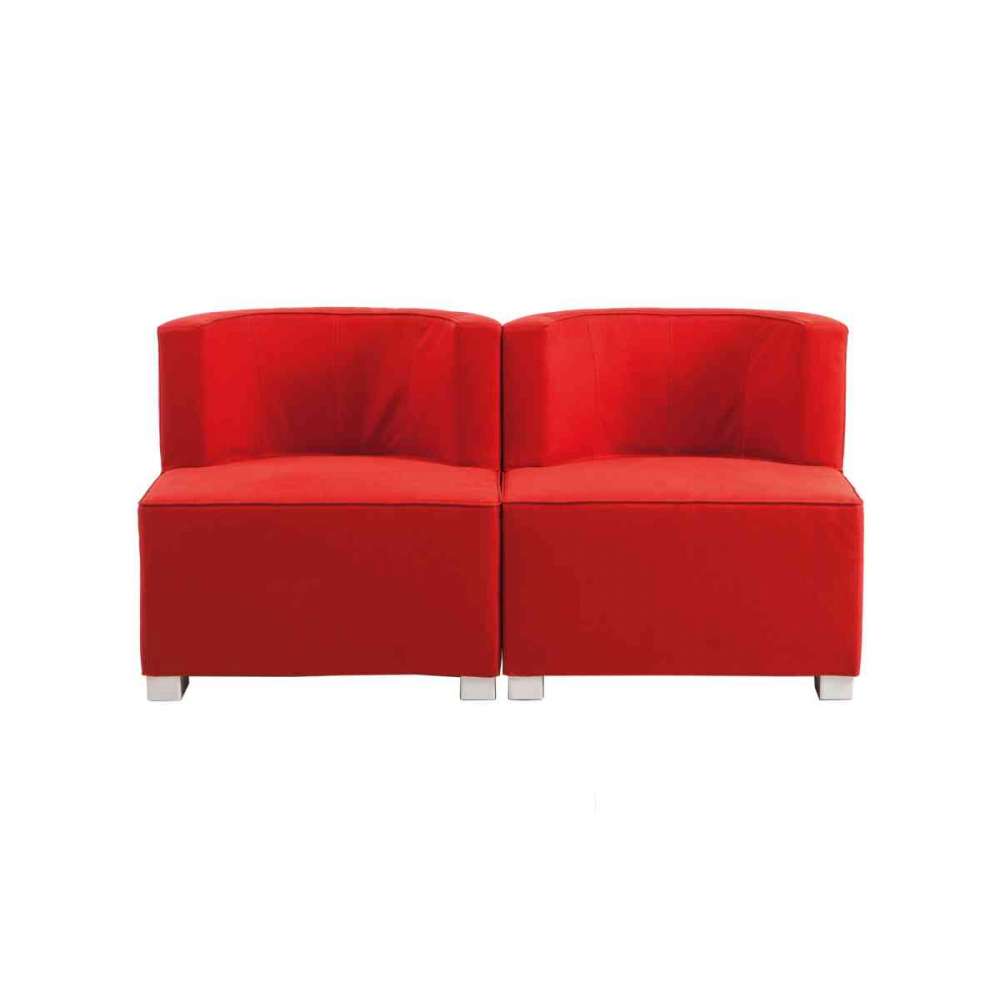 Widząc podwójnie: symetrycznie ułożone, te dwie sofy wyglądają jak para skrzydeł. Po prawej zaakcentowana jest przekątna, natomiast powyższa aranżacja kładzie większy nacisk na zmysłowo wygięte oparcie. Na zdjęciu po lewej pojemnik w kształcie trapezu łączy dwie sofy, tworząc obszerną formację. Każda z tych trzech aranżacji podkreśla indywidualność, siłę i żywotność tego projektu.