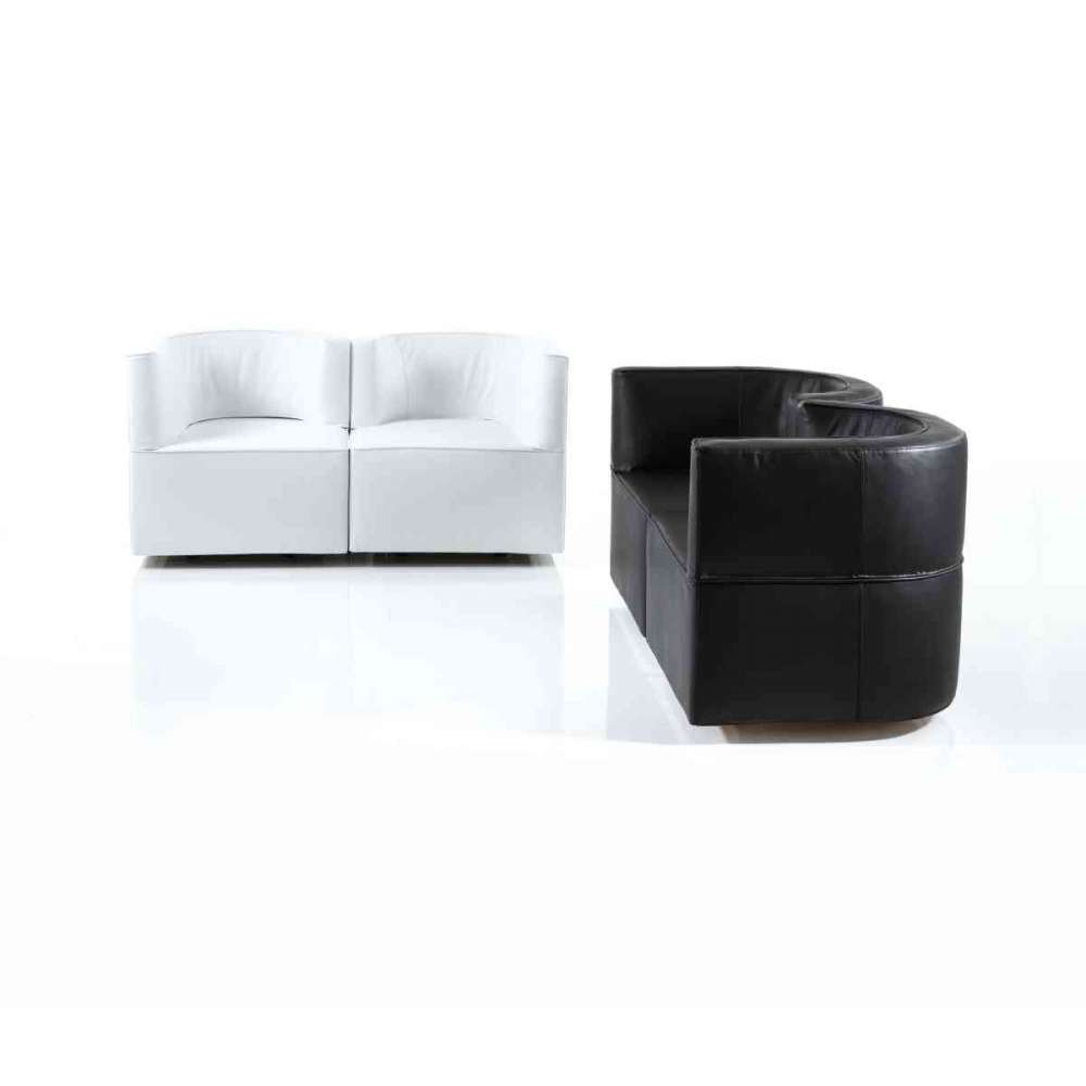 Ten harmonijnie połączony zestaw, składający się z krzesła z krótkimi elementami wypoczynkowymi i sofy, charakteryzuje się elementarną lekkością, wyrazistymi zaokrąglonymi kształtami i wyrazistością inspirowaną grafiką. Obie w białej skórze. Projekt jest idealną syntezą emocji i abstrakcji.