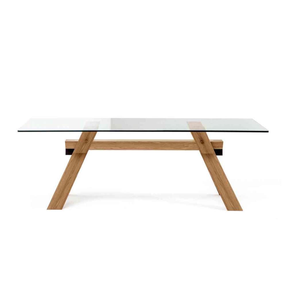 Stół z podstawą z litego drewna w kolorze orzecha krajowego lub dębu naturalnego, bejcowanego lub lakierowanego matowo. Prostokątny szklany blat.