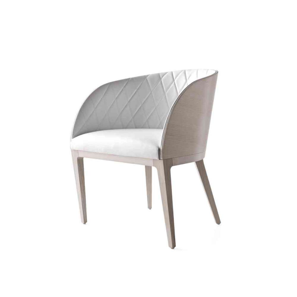 Fotel z nogami i zewnętrznym oparciem z drewna bukowego, lakierowany w kolorze naturalnym, bejcowanym lub matowym. Pikowana wewnętrzna część pleców ze skóry lub tkaniny. Tapicerowane siedzisko.