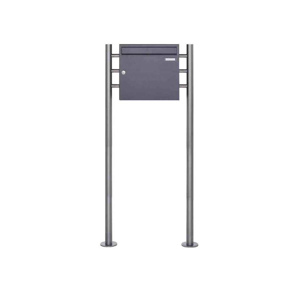 Standbriefkasten Design BASIC 381 ST-R - DB703 eisenglimmer Moderner Standbriefkasten wyprodukowany w Niemczech przez Briefkasten Manufaktur. Der Briefkasten besteht aus verzinktem Stahl, pulverlackiert in DB703 eisenglimmer , die Standelemente aus witterungsbeständigem Edelstahl V2A, geschliffen. Die sehr hochwertige Verarbeitung und das durchdachte Konzept machen diesen Standbriefkasten zu unserem Topseller. Eine Regenablaufkante zum Optimal Wasserschutz, eine durchgehende Gummilippe für leisen Einwurf, das solide Wechselnamensschild, ein praktischer Posthaltebügel und das sehr robuste Schloss zeichnen diesen Standbriefkasten aus. Dieser Briefkasten ist pflegeleicht und unempfindlich. Dank der Konstruktionsweise gestaltet sich die Selbstmontage unkompliziert. Perfekt wird die Gestaltung Ihres Eingangsbereichs, wenn Sie die selbstklebende Hausnummer aus Edelstahl kombinieren (Nicht im Lieferumfang enthalten, siehe Zubehör). Standbriefkasten aus verzinktem Stahl, pulverlackiert in DB 703 eisenglimmer. Die Anlage wird bei der Briefkasten Manufaktur erstellt. Deutsche Qualitätsfertigung „Made in Germany”. Der Briefkasten entspricht der DIN/EN 13724. Einwurfgröße (3,5 cm x 32,5 cm) für C4 quer, hier passen auch große Briefe rein, ohne zu knicken. Einwurfklappe mit geräuschdämpfender Gummidichtung für sehr leisen Einwurf der Post. Die Tür ist von links nach rechts zu öffnen. Inkl. 2 Schlüssel mit Schlüsselnummer, Wechselnamensschild unter der Einwurfklappe und Posthaltebügel. Grosses Fassungsvermögen durch opcjonalnie Briefkastentiefe +50 mm = ca. 17 l. Geeignet für Unternehmen und Haushalte mit sehr großem Postaufkommen. Zusätzlichen Regenschutz erreichen Sie durch das optione Regenschutzdach aus Edelstahl V2A, geschliffen. Die Standelemente bestehen aus 42,4 mm V2A Edelstahl 1.4301, geschliffen zur Schraubmontage oder zum Einbetonieren. Wichtige Information: Die Post ist nur bei vollständigem Einwurf und geschlossener Klappe vor Feuchtigkeit und Verschmutzung geschützt. Bei bestimmten extremen Witterungsbedingungen kann dennoch Wasser eintreten (dosłownie DIN EN 13724 bis 1ccm). Dies ist kein Reklamationsgrund.