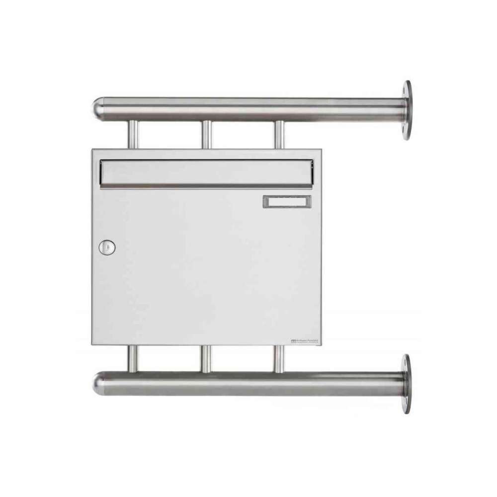 Edelstahl Briefkasten BASIC 810 W zur seitlichen Wandmontage Dieser Briefkasten vereint allerhöchste Qualität und modernes Design. Der Briefkasten besteht komplett aus Edelstahl V2 A 1.4301, geschliffen. Das Schleifbild besticht durch die Ausstrahlung von höchster Eleganz. Extrem hochwertige Verarbeitung und das durchdachtes Konzept machen diesen Standbriefkasten zu unserem Topseller. Eine Regenablaufkante zum Optimal Wasserschutz, eine durchgehende Gummilippe für leisen Einwurf und das sehr robuste Wechselnamensschild zeichnen diesen Briefkasten aus. Dank der Konstruktionsweise gestaltet sich die Selbstmontage unkompliziert. Der Briefkasten wird von der Briefkasten Manufaktur erstellt. 100% Made in Germany, Bad Salzuflen. Briefkasten aus Edelstahl V2A 1.4301, geschliffen. Die Entnahmetüren sind von links nach rechts zu öffnen mit Regenablaufkante für Optimal Wasserschutz. Einwurfklappe mit geräuschdämpfender Gummidichtung für sehr leisen Einwurf der Post. Mit Wechselnamensschild und 2 Schlüsseln. Die Briefkästen entsprechen der DIN EN 13724. Einwurfgröße (3,5 cm x 32,5 cm) für DIN C4 quer, hier passen auch große Briefe rein, ohne zu knicken. Die Befestigungssäulen bestehen aus 42,4 mm Edelstahl V2A 1.4301, geschliffen zur Schraubmontage an der Hauswand. Wichtige Information: Die Post ist nur bei vollständigem Einwurf und geschlossener Klappe vor Feuchtigkeit und Verschmutzung geschützt. Bei bestimmten extremen Witterungsbedingungen kann dennoch Wasser eintreten (dosłownie DIN EN 13724 bis 1ccm). Dies ist kein Reklamationsgrund.