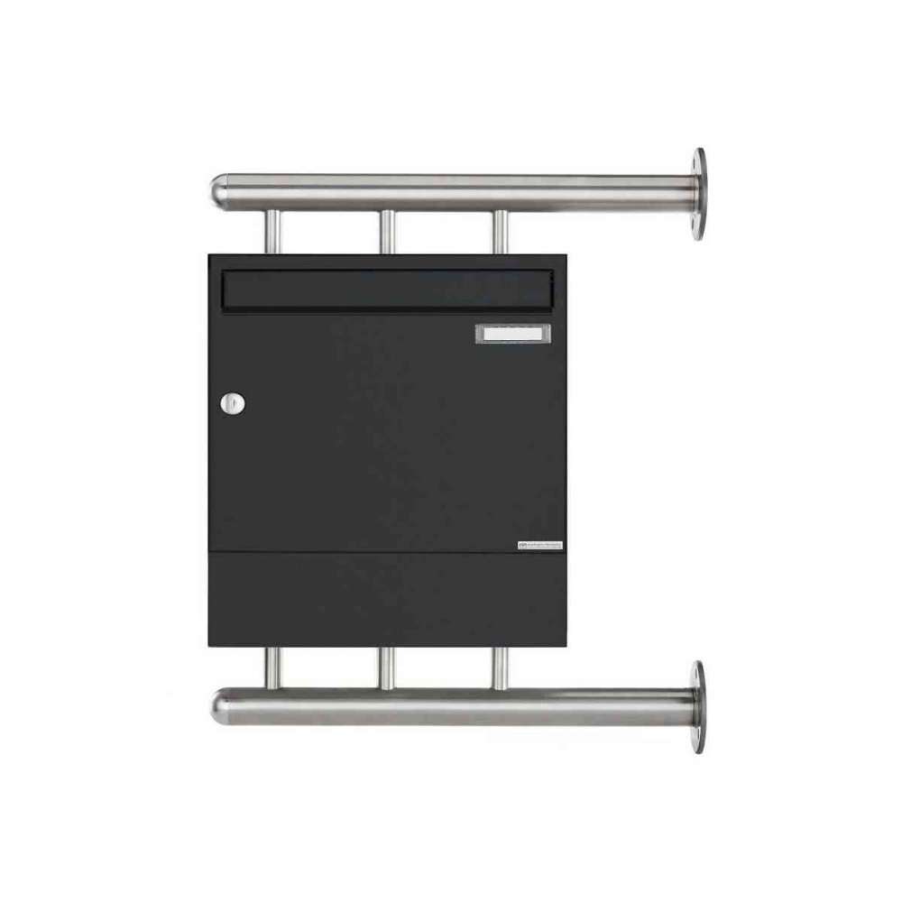 Briefkasten BASIC 810-W mit Zeitungsfach - RAL 7016 Anthrazitgrau / Edelstahl - Wandmontage, seitlich Dieser Briefkasten vereint allerhöchste Qualität und modernes Design. Der Briefkasten besteht aus verzinktem Stahl, pulverlackiert in Anthrazit-Grau RAL 7016 feinstruktur, matt. Extrem hochwertige Verarbeitung und das durchdachtes Konzept machen diesen Standbriefkasten zu unserem Topseller. Eine Regenablaufkante zum Optimal Wasserschutz, eine durchgehende Gummilippe für leisen Einwurf und das sehr robuste Wechselnamensschild zeichnen diesen Briefkasten aus. Dank der Konstruktionsweise gestaltet sich die Selbstmontage unkompliziert. Der Briefkasten wird von der Briefkasten Manufaktur erstellt. 100% Made in Germany, Bad Salzuflen. Briefkasten aus verzinktem Stahl, pulverlackiert in anthrazit-grau RAL 7016 feinstruktur, matt. Zeitungsfach aus Edelstahl V2A, , pulverlackiert anthrazit-grau RAL 7016 feinstruktur, matt. Beidseitig wyłączony. Die Entnahmetüren sind von links nach rechts zu öffnen mit Regenablaufkante für Optimal Wasserschutz. Einwurfklappe mit geräuschdämpfender Gummidichtung für sehr leisen Einwurf der Post. Mit Wechselnamensschild und 2 Schlüsseln. Der Briefkasten entspricht der DIN EN 13724. Einwurfgröße (5,5 cm x 34,0 cm) für DIN C4 quer, hier passen auch große Briefe rein, ohne zu knicken. Die Befestigungssäulen bestehen aus 42,4 mm Edelstahl V2A 1.4301, geschliffen zur Schraubmontage an der Hauswand. Wichtige Information: Die Post ist nur bei vollständigem Einwurf und geschlossener Klappe vor Feuchtigkeit und Verschmutzung geschützt. Bei bestimmten extremen Witterungsbedingungen kann dennoch Wasser eintreten (dosłownie DIN EN 13724 bis 1ccm). Dies ist kein Reklamationsgrund.