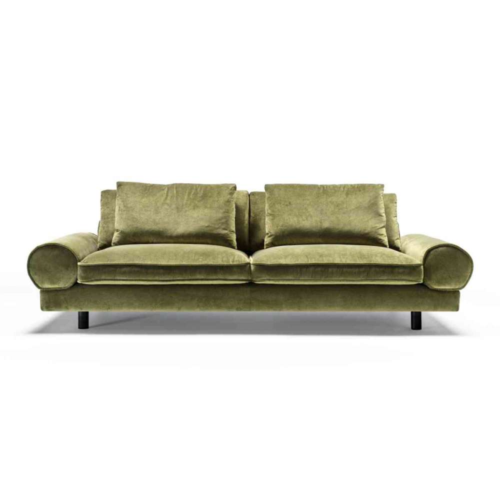 Sofa o konstrukcji z drewna topolowego, ze skrzyżowanym elastycznym systemem sprężyn pasowych. Wyściółka z ekspandowanego poliuretanu o dużej gęstości, tapicerka z termozgrzewalnego włókna z elastyczną dzianiną dżersejową. Poduszki siedziska w 100% z europejskiego puchu kierunkowego, zamknięte w niezależnych pomieszczeniach, wypełnienie z wkładem centralnym wysokoelastycznej pianki poliuretanowej o różnych gęstościach oraz pianki memory. Poduszki oparcia w 100% z europejskiego puchu kanałowego, zamknięte w niezależnych pomieszczeniach. W pełni zdejmowane pokrowce z tkaniny, tylko poduszki w wersji skórzanej. Nogi z metalu w kolorze czarnym matowym.
