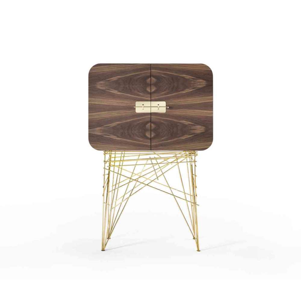 Bar alkoholowy z konstrukcją nośną z polerowanej złotej stali nierdzewnej, lakierem poliestrowym o wysokim połysku z drewnianą szafką, dostępny w kolorze czerwonym, ciemnoniebieskim i zielonym. Wewnętrzna półka i wyjmowana taca w wykończeniu canaletto. Wewnętrzna ściana w antycznym lustrze.