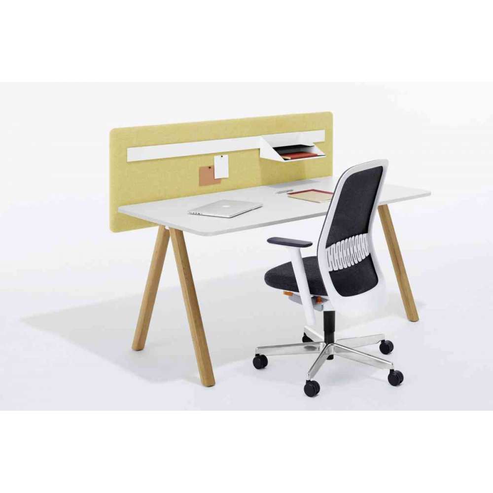 Ta symetryczna rama stołu jest dostępna ze stali malowanej proszkowo (w kolorze czarnym lub białym) ze stałą wysokością (74 cm) lub z regulacją wysokości (65–85 cm). Alternatywnie, jeśli chcesz dodać trochę ciepła do swojego miejsca pracy, dostępna jest również dębowa rama z naturalnym lakierem jako opcja o stałej wysokości (74 cm). przytulność do miejsca pracy. Panele stołowe porządkują i dzielą biuro przy użyciu różnych wysokości, kolorów i materiałów, tworząc określone obszary robocze. Włączenie tapicerowanych paneli tworzy domową atmosferę. Atrakcyjne przegródki spełniają różne funkcje: stalowe półki, drewniane wstawki z otworami na kable i doniczki.