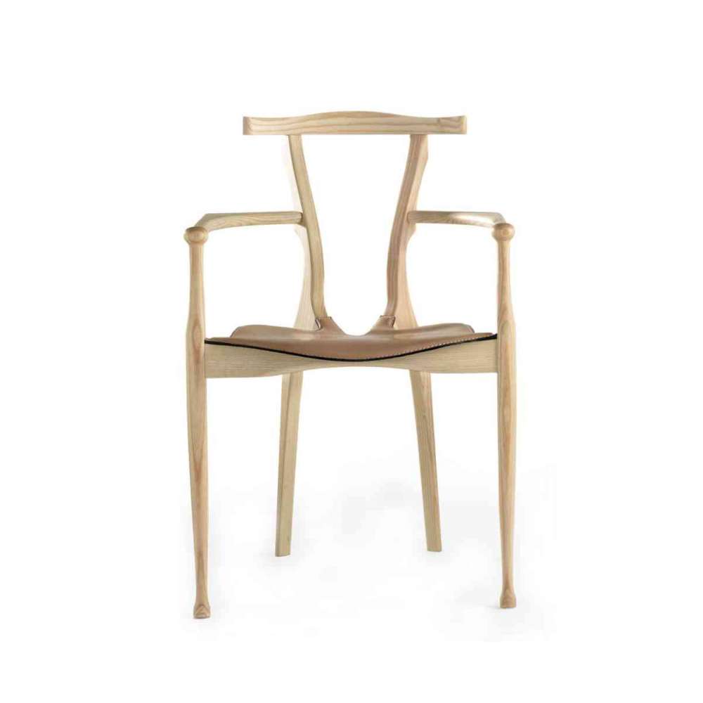 Konstrukcja i tył z litego jesionu lakierowanego lub bejcowanego. Siedzisko z wewnętrzną ramą w kolorze dębu i tapicerowane skórą.