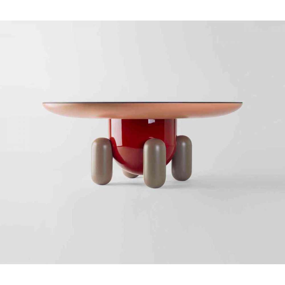 Lakierowany korpus z włókna szklanego. Solidne drewniane nogi toczone i lakierowane. Blat ze szkła malowanego.