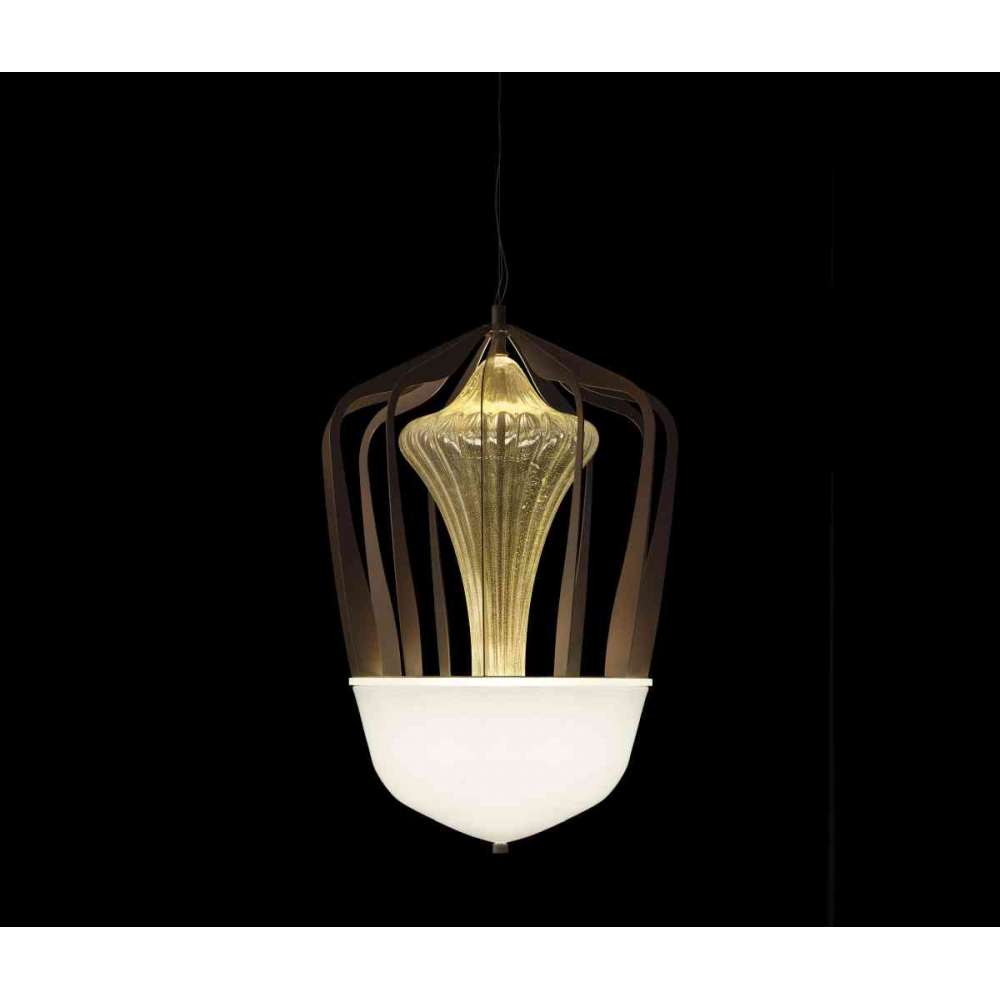 To, co unosi się w tej doskonale zaprojektowanej, dobrze wykończonej i najwyraźniej lekkiej metalowej klatce, to nie czerwony rudzik, ale prążkowany szklany element oświetlony przez źródło światła LED u podstawy, ukryte w białej, nieprzezroczystej podstawie, która również świeci. Panel z pleksiglasu, którego wypolerowane krawędzie świecą w wyniku załamania, oddziela dwa szklane elementy i pomaga w rozproszeniu światła generowanego przez diody LED o łącznej mocy 35W, które gwarantują doskonałą moc oświetlenia przy zdecydowanie ograniczonym zużyciu. Metalowe kołnierze mogą być w błyszczącym chromie lub w nowym satynowanym brązie. Dostępny jest w dwóch modelach. Diody LED są dołączone.