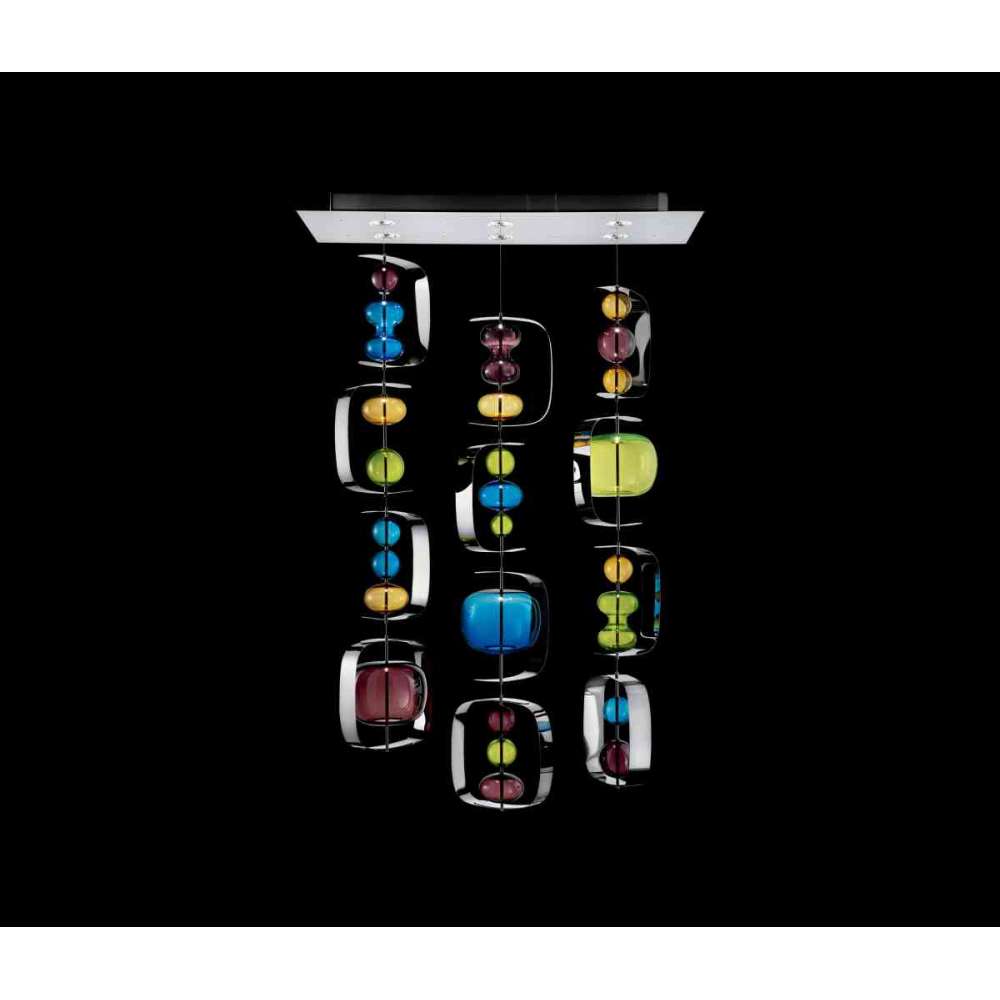 Zawieszone metalowe ramy, z których dmuchane bąbelki weneckiego kryształu unoszą się w powietrzu. Dostępny w dwóch paletach kolorystycznych lub w wersji białej i transparentnej. Trzy różne kompozycje (jedna, trzy lub cztery liny stalowe) i dwie wysokości.