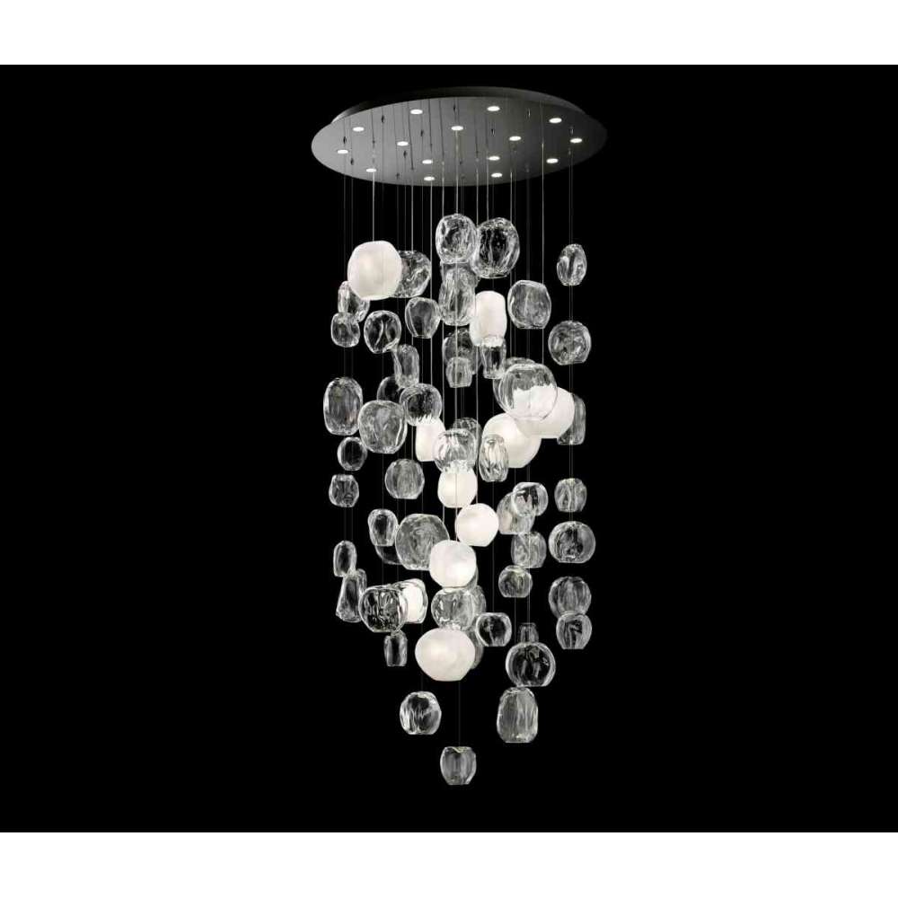 Podobnie jak w gigantycznym akwarium, gdzie pęcherzyki powietrza wdzięcznie unoszą się na powierzchnię, elementy dmuchanego szkła w odwróconym do góry świecie Hanami o nieregularnych powierzchniach (w kolorach akwamarynu, szarości, płynnej cytryny czy kryształów) spadają z płyty sufitowej z tą samą lekkością i elegancją, tworząc gęstą chmurę odbić i załamań. W tej delikatnie zabarwionej chmurce zanurzonych jest od 4 do 13 elementów, wykonanych z matowego białego szkła z odcieniami koloru identycznego z dominującym, ukrywających diodowe źródła światła. Reflektory wbudowane w konstrukcję sufitu to również diody LED. Dostępnych jest pięć modeli z katalogu, wszystkie diody LED są dołączone.