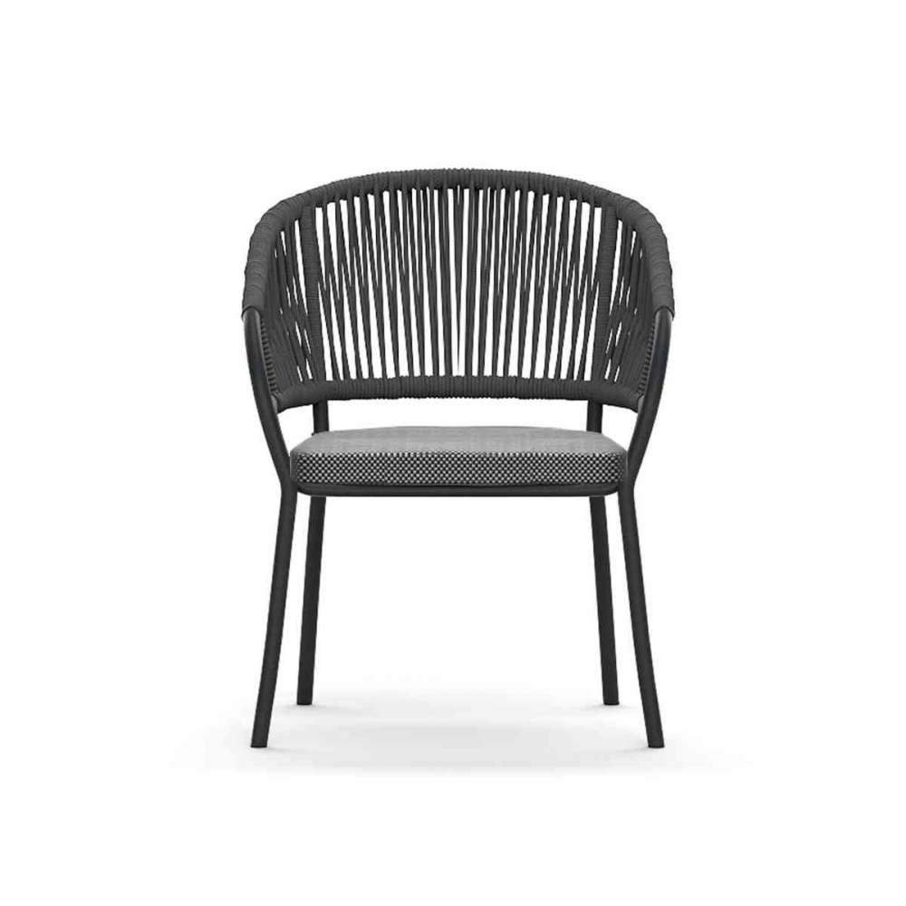 Eleganckie siedzisko w kolorze białym lub grafitowym aluminium pokryte jest tkanym splotem lin przypominającym włókna tekstylne.