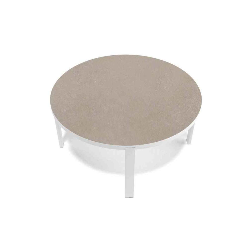 Aluminiowa konstrukcja w kolorze białym lub grafitowym do użytku na zewnątrz Blat HPL lub kamionka, dostępny w dwóch kolorach Średnica: 150 cm Wysokość: 78 cm Waga: 34/65 Kg Pojemność: 1,35 m3