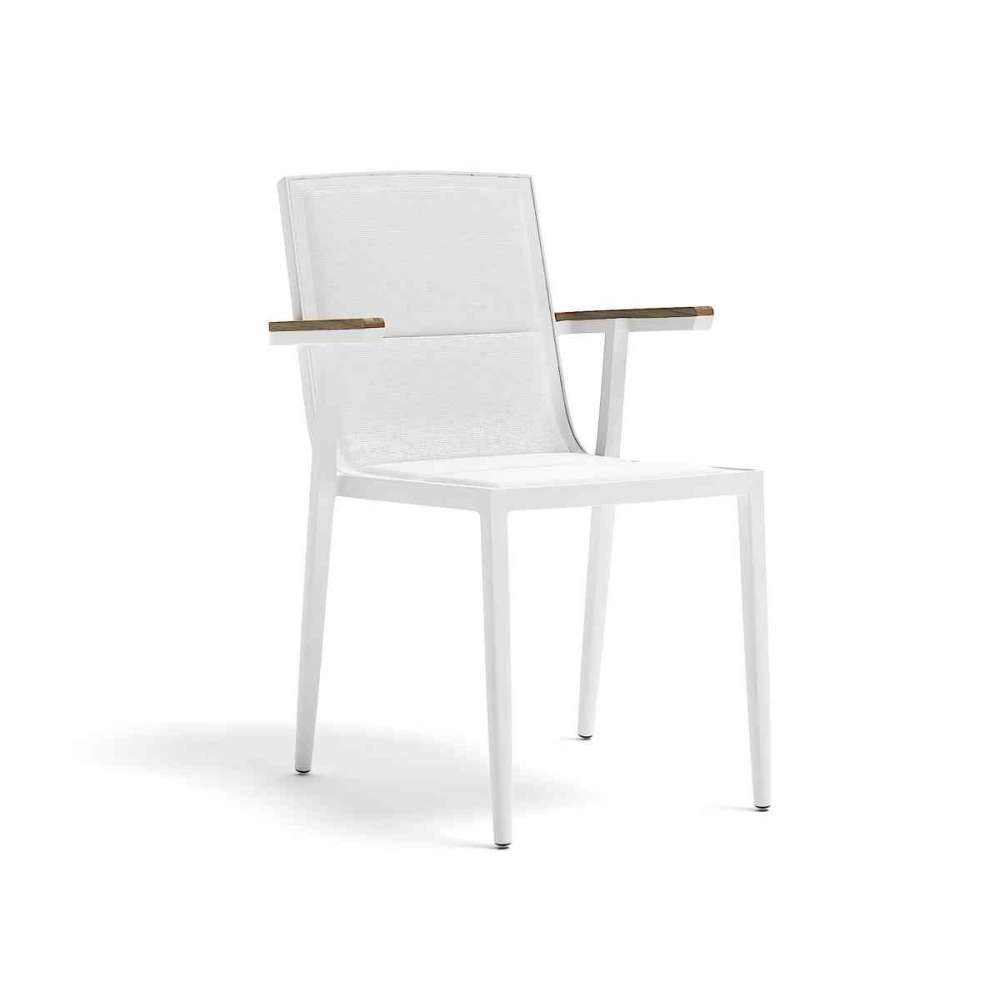 Aluminiowa konstrukcja pomalowana białą farbą epoksydową do użytku na zewnątrz. Siedzisko i oparcie z mikrozgrzewanej tkaniny tekstylnej. Detale podłokietników wykonane są z azjatyckiego drewna tekowego. Wymiary: 60 x 56 x 83 cm Waga: 4 Kg Pojemność: 0,30 m3 Wysokość siedziska: 44 cm Wysokość podłokietników: 64 cm
