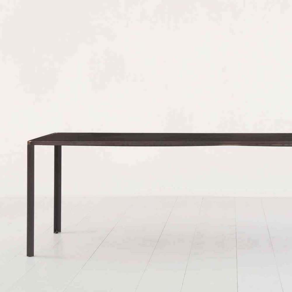 Surowa stal z lakierem antykorozyjnym, blat z płyty wiórowej z linoleum. Charakterystyczne są lekkie ślady szlifowania.