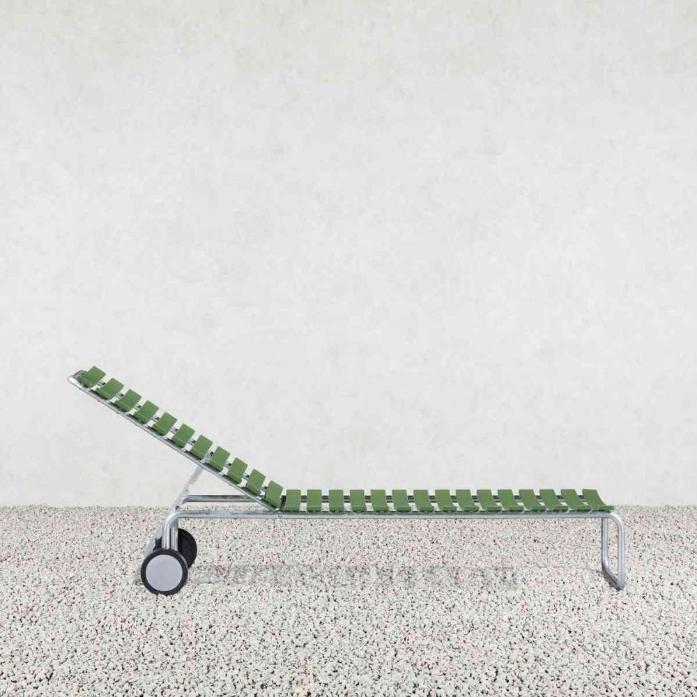 Leżak. Lamele z odpornego na warunki atmosferyczne drewna jesionowego, impregnowanego naturalnym lub lakierowanego w dziesięciu standardowych kolorach. Ocynkowana ogniowo, opcjonalnie barwiona rama stalowa. Na kółkach.