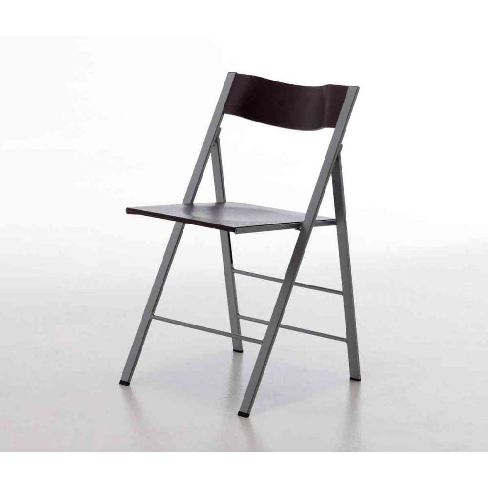 Krzesło składane z chromowaną lub malowaną stalową ramą oraz siedziskiem i oparciem ze sklejki bukowej lub jesionowej.