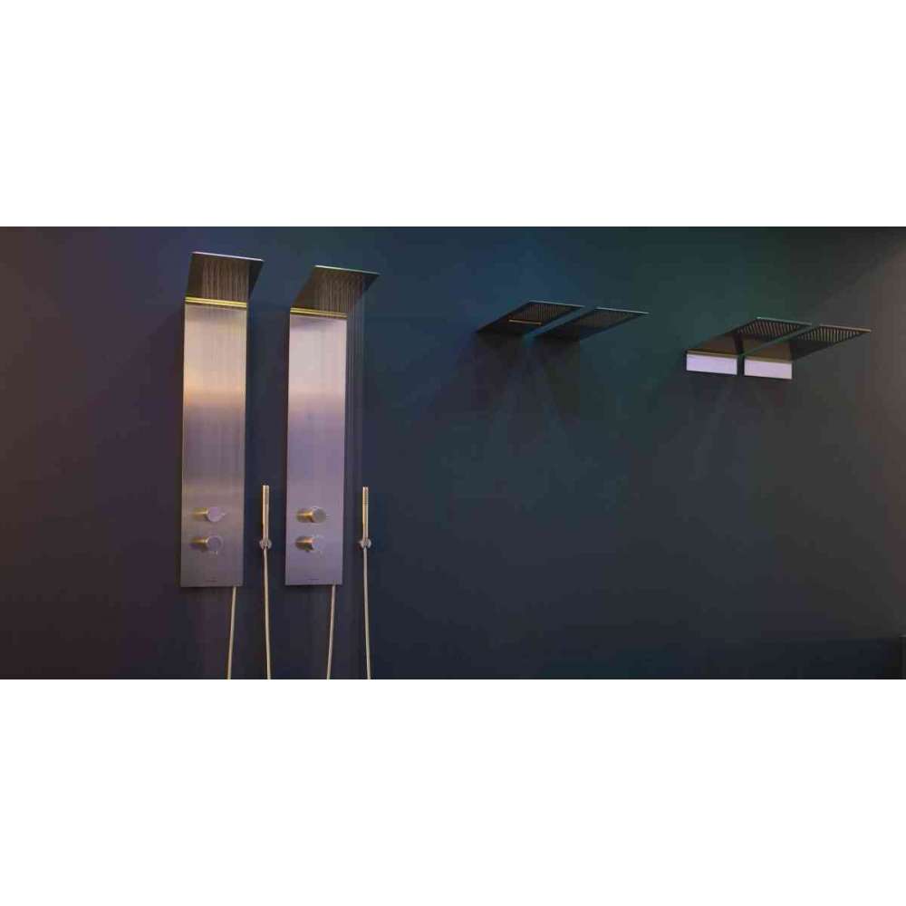Ciągły element, czysta i niezbędna stalowa płyta z precyzyjnymi liniami siatki, które płynnie łączą kolumnę prysznicową i głowicę. Vela oferuje elegancką powierzchnię z satynowej stali nierdzewnej, ciągły profil, który elegancko łączy pionową sekcję kolumny i poziomą sekcję głowicy lekko pochyloną do góry, aby wzmocnić zasięg opadów. Vela jest dostarczana w komplecie z baterią termostatyczną, uchwytem sterującym z przełącznikiem i główką prysznicową.