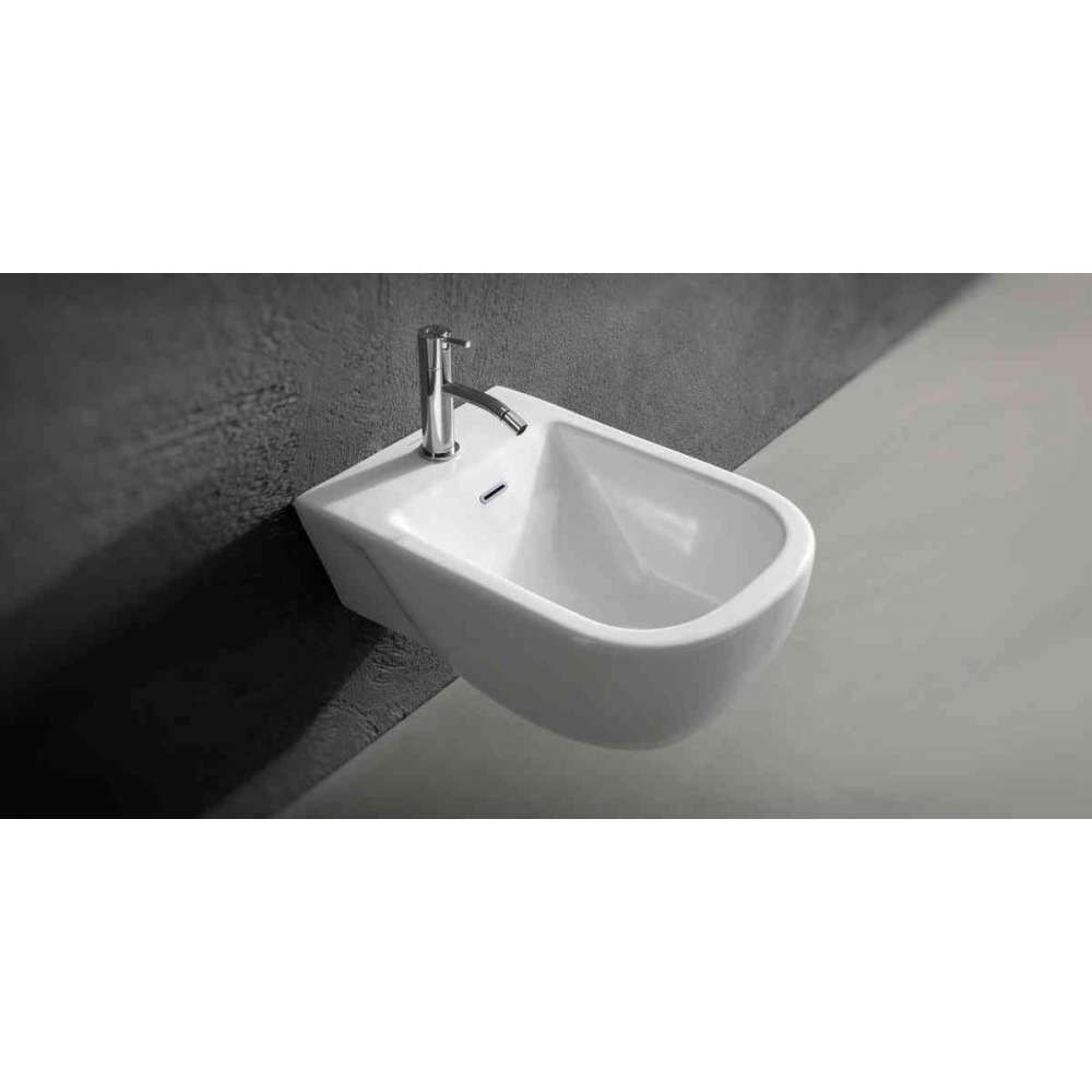 Lekko zdefiniowane miękkie proporcje, otaczające, ergonomiczne bryły zwężają się w ścianie. Podwieszana ceramiczna ceramika sanitarna w komplecie ze zdejmowanym termoutwardzalnym pokrowcem na deskę z miękkim zawiasem i bidetem z pojedynczym centralnym otworem na baterię.