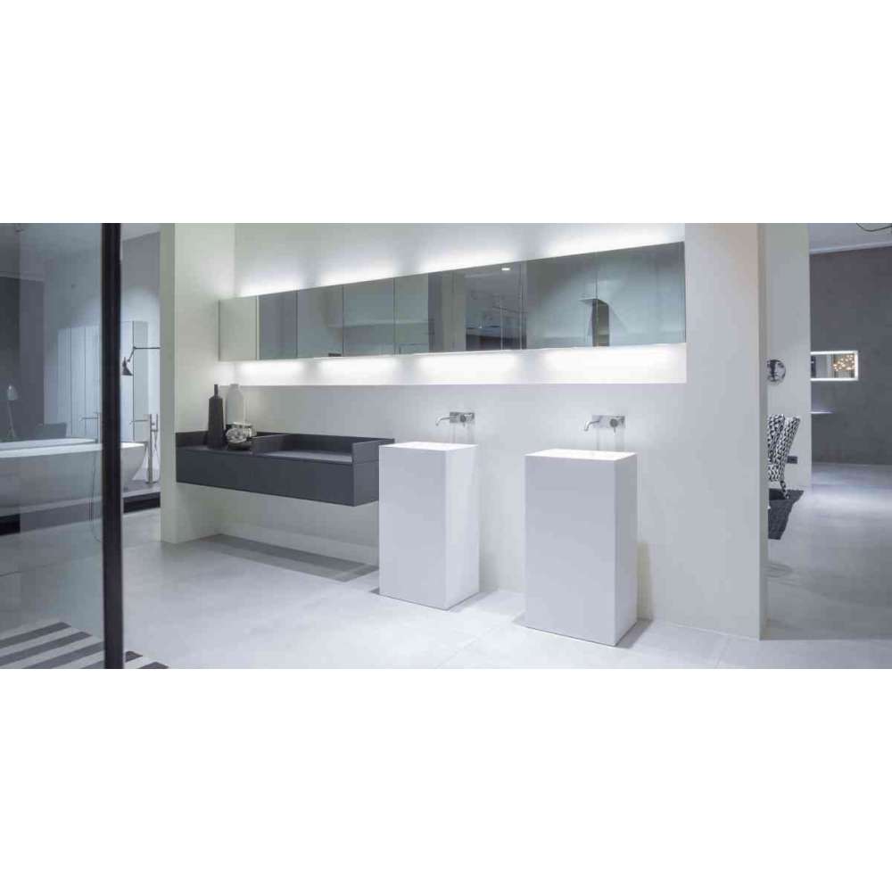 Fusto to wolnostojąca umywalka o zasadniczych kształtach i niewielkiej objętości. Zlew wygląda bardzo prostokątnie i minimalistycznie, ale ma bardzo wyraźne formy z miękką i okrągłą misą wewnętrzną. Poręczny wieszak na ręczniki umieszczony z boku podkreśla funkcjonalność.