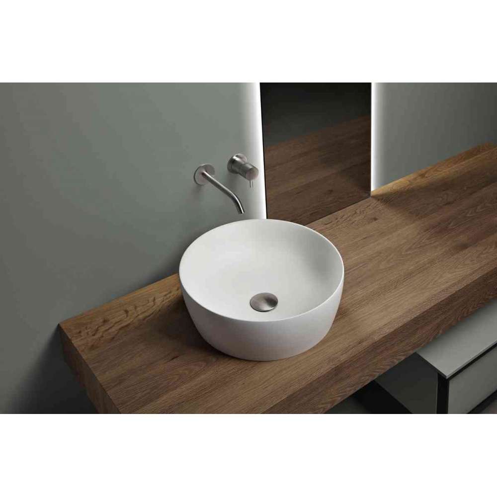 Catino to okrągła umywalka wykonana z Flumood, nowego ekologicznego, kompaktowego, nieporowatego i nietoksycznego materiału o łatwej do czyszczenia powierzchni. antoniolupi prezentuje w tym materiale Catino, umywalkę o eleganckim, czystym i esencjonalnym stylu.