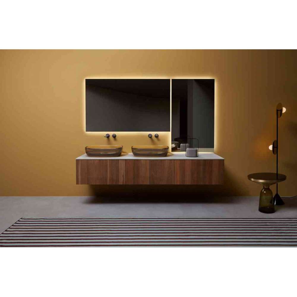 Binario 03 jest dostępny tylko w wersji lakierowanej matowej lub wytłaczanej we wszystkich kolorach z gamy antoniolupi. Meble z kolekcji Binario 03 można łączyć z blatami z serii Ponte, które idealnie współgrają tworząc rowek ciągnący się wzdłuż całej kompozycji i pozwalający na łatwe otwieranie frontu. Faktura, która nadaje całości ruch i głębię, gra cieni, która „rysuje” ostateczny obraz mebla. Binario 12 dostępny jest zarówno w wersji z esencją drewna, jak i w wersji lakierowanej w wykończeniu matowym lub wytłaczanym.