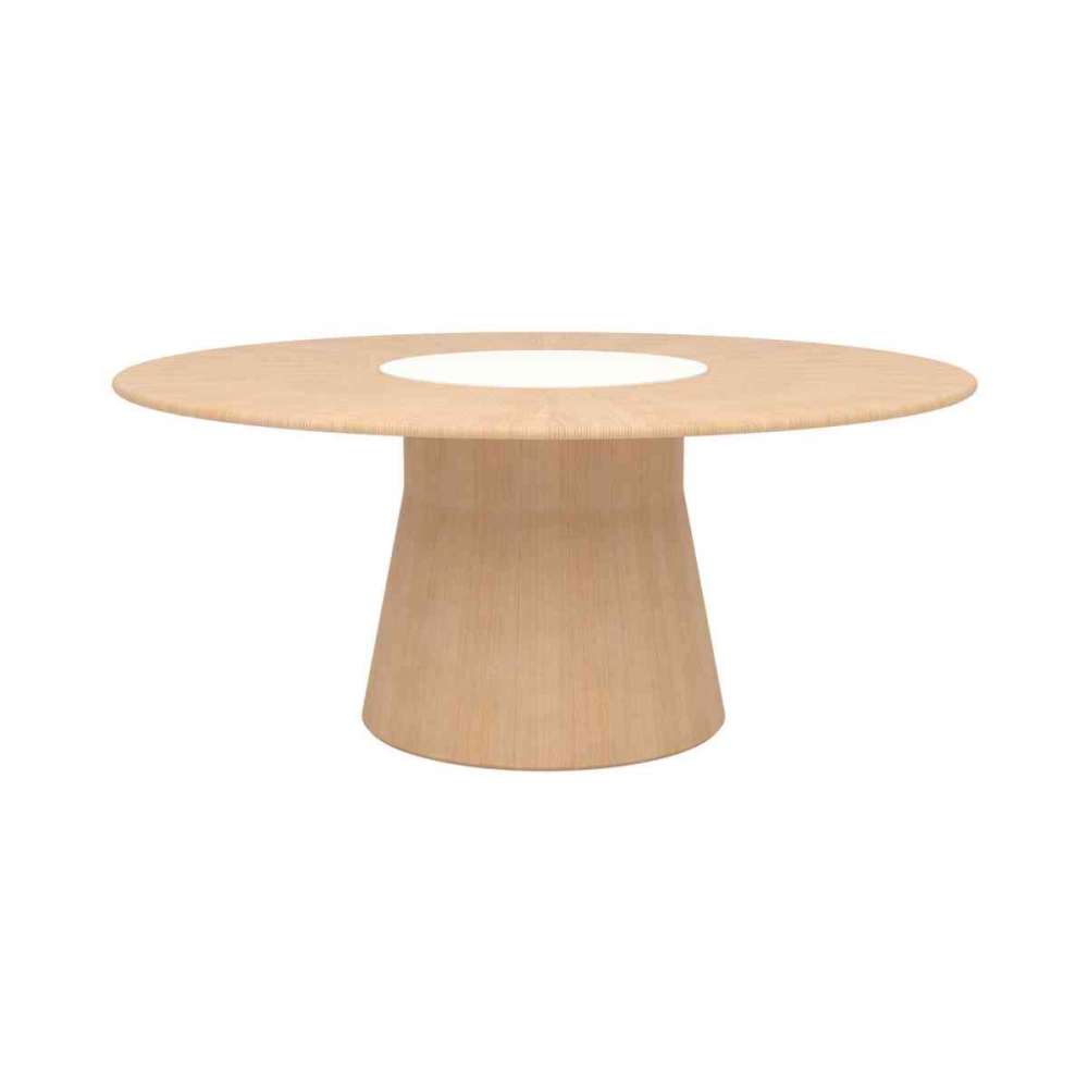 Program stołów z centralną podstawą i blatem z jesionu, dostępny obrotowy blat z marmuru, lakierowanego drewna lub kamienia Dekton. Tylko wersja z okrągłym blatem, w 3 rozmiarach. Dostępna skrzynka przyłączeniowa. *Jeśli blat jest zelektryfikowany, obrotowy środkowy blat zostanie zamocowany.