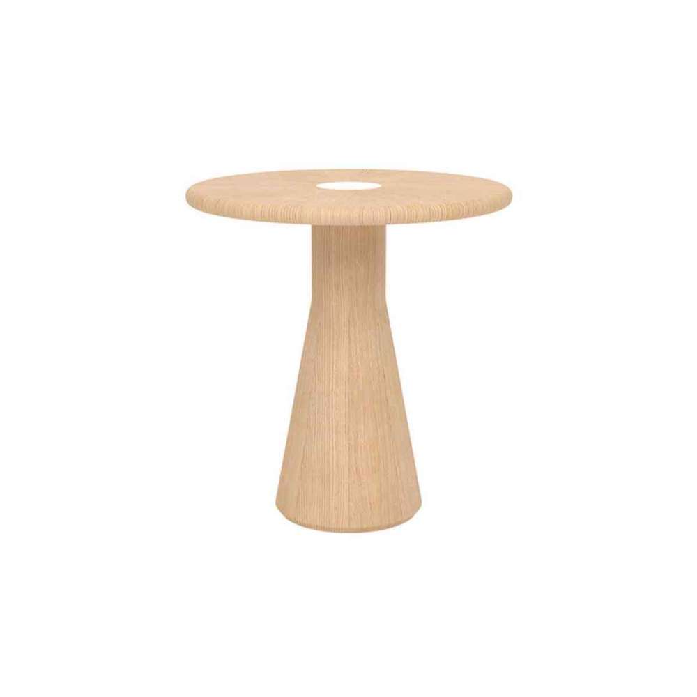 Okazjonalny stół z centralną podstawą i blatem z drewna jesionowego, z centralnym blatem z marmuru, lakierowanego drewna lub Dekton Stone. Wersja tylko z okrągłymi blatami, w 2 rozmiarach. Dostępny w 2 wysokościach.