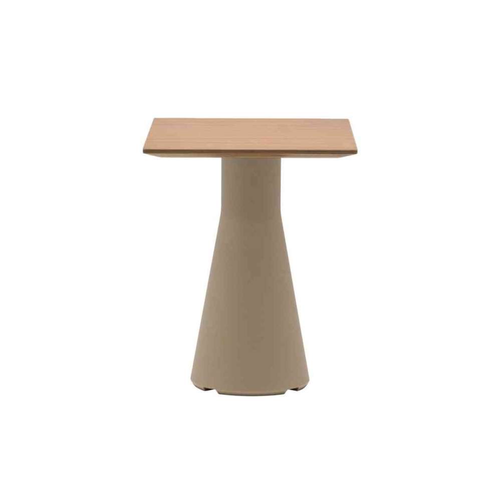 Stolik okolicznościowy z centralną podstawą z polietylenu, dostępny w 6 różnych kolorach i kwadratowym blatem ze sklejki dębowej. Opcjonalne wykończenie bazowe lakierem o wysokim połysku.