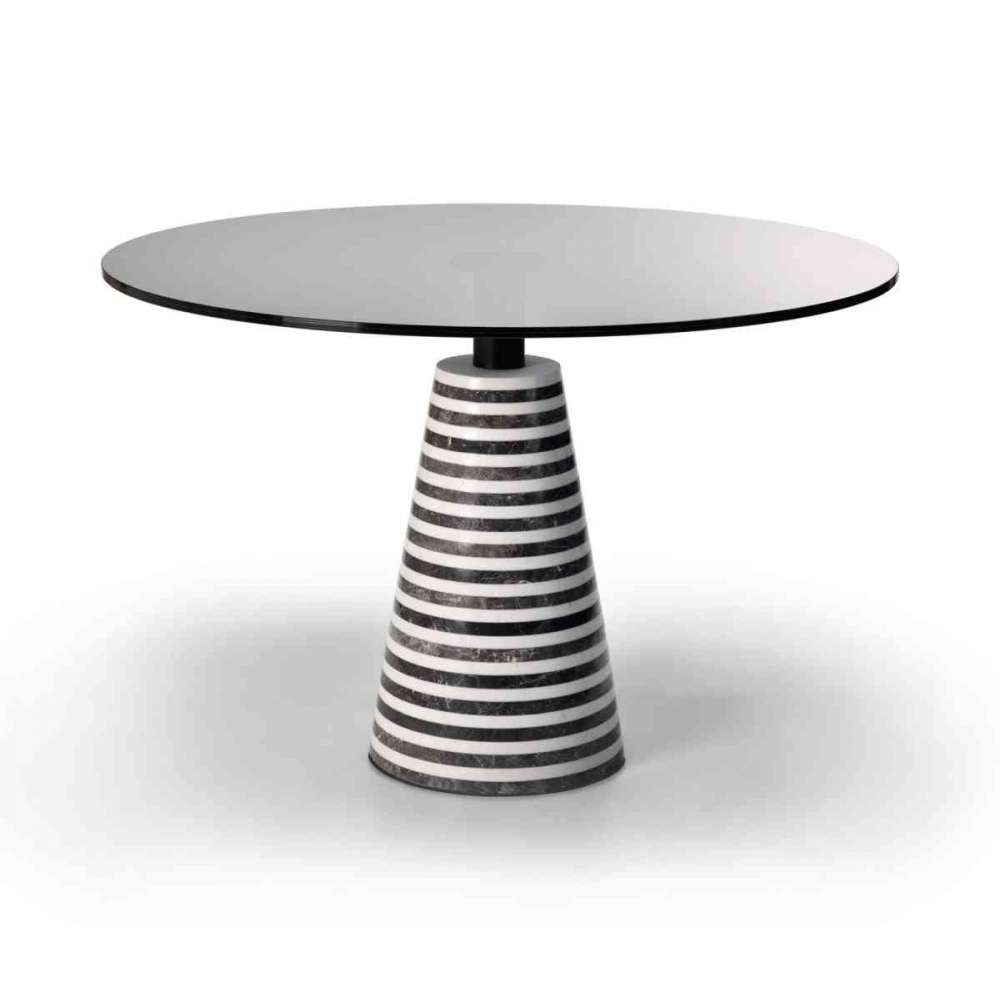 Harmonia czerni i bieli. Futurystyczne akcenty marmurowych pasków. Olśniewający, a momentami hipnotyzujący efekt, który chwyta za serce i oko. Wyjątkowe połączenie klasycznych i nowoczesnych detali… Te współczesne stoły z marmuru prezentują okrągły blat z barwionego szkła oparty na podstawie z litego marmuru w symetryczne czarno-białe paski. Kolekcja Orbit, wykonana w pięknym, nowoczesnym kształcie, uzupełnia szereg stylów wnętrzarskich. Fachowo ręcznie wykonane i ręcznie wykończone, łączą modernistyczny styl z naturalną krawędzią.