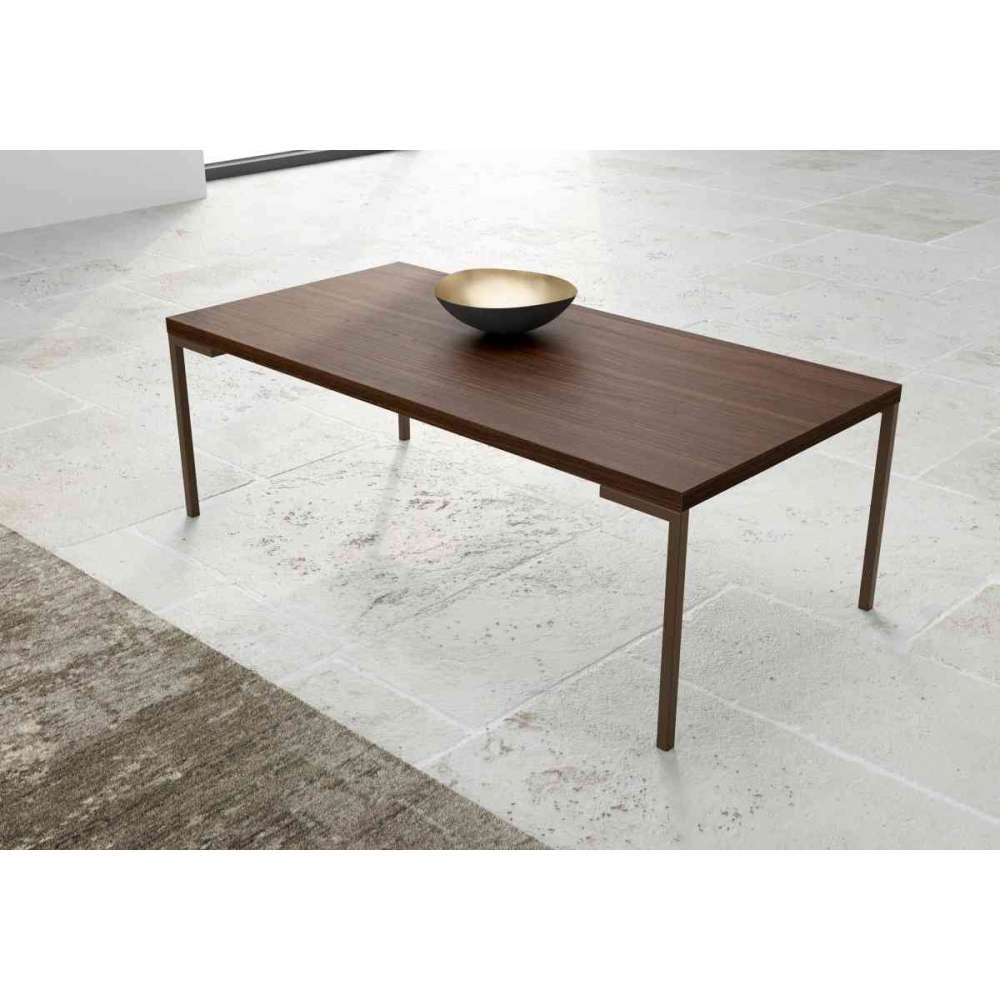 Prostokątny stolik kawowy (120x60 cm) wys. 40 cm. Blat z forniru drewnianego lub melaminy i metalowe nogi. Kolory: orzech poddany obróbce cieplnej i ardezja