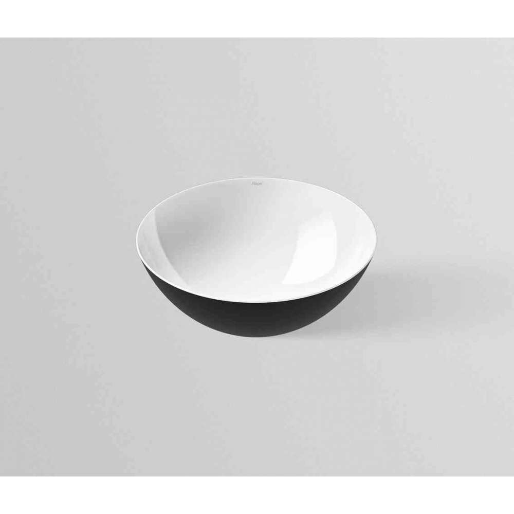 Umywalka okrągła, Ø 360 mm, wys. 130 mm, stal szkliwiona, czarny mat/biały połysk, bez otworu na baterię, bez przelewu, w zestawie, zawór spustowy, zaślepka zaworu, biały szkliwiony, czarny pierścień dystansowy