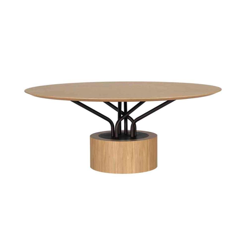 Stół w różnych rozmiarach z wyprofilowanym okrągłym blatem i drewnianą zakrzywioną podstawą ze sklejki. Metalowa podstawa i metalowe elementy podstawy.