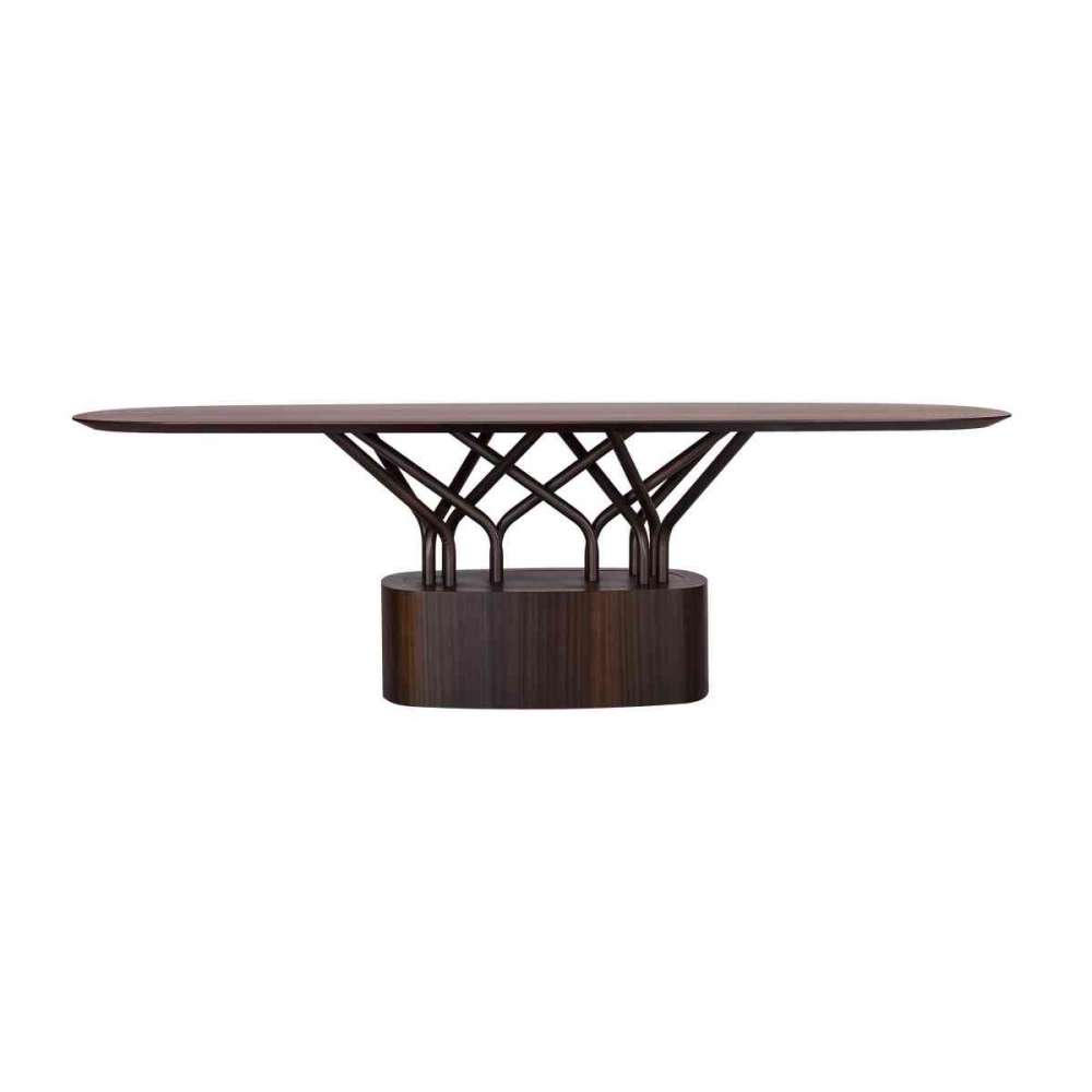 Stół w różnych rozmiarach z wyprofilowanym mydlanym blatem i drewnianą zakrzywioną podstawą ze sklejki. Metalowa podstawa i metalowe elementy podstawy.