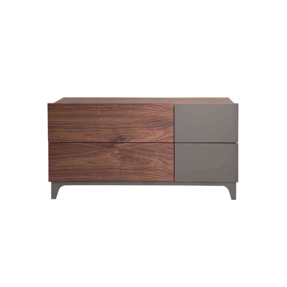 Komoda z 4 szufladami w różnych rozmiarach z lakierowaną metalową podstawą.